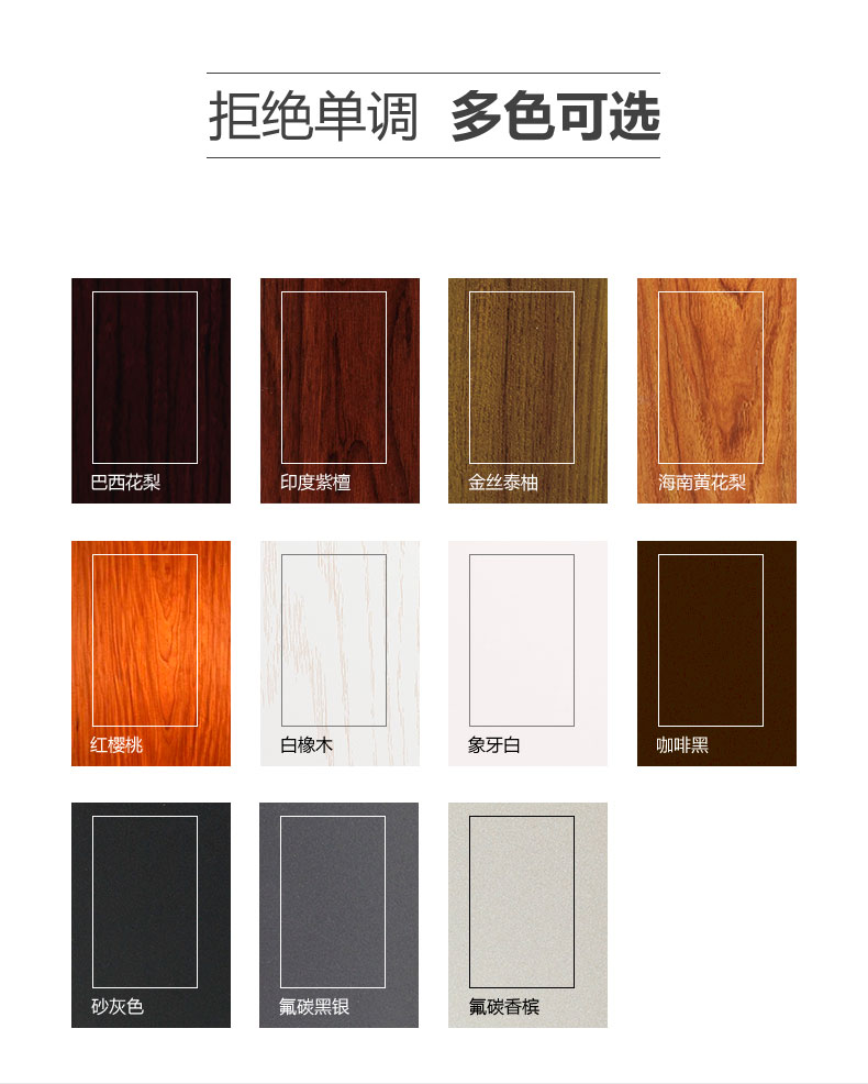內(nèi)色:巴西花梨、印度紫檀、紅櫻桃、柚木色、海南黃花梨、 白橡木、象牙白、氟碳香檳、氟碳黑銀、砂灰、咖啡黑