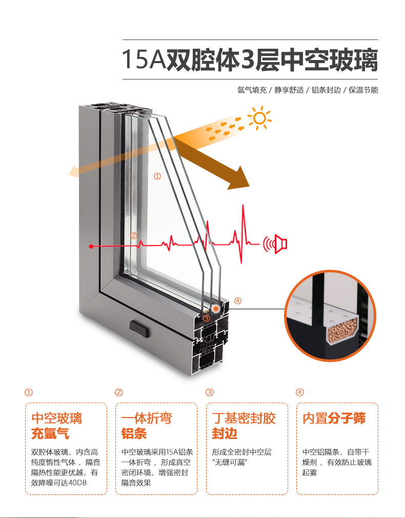 2、汽車級(jí)鋼化玻璃,內(nèi)充氬氣,有效隔音